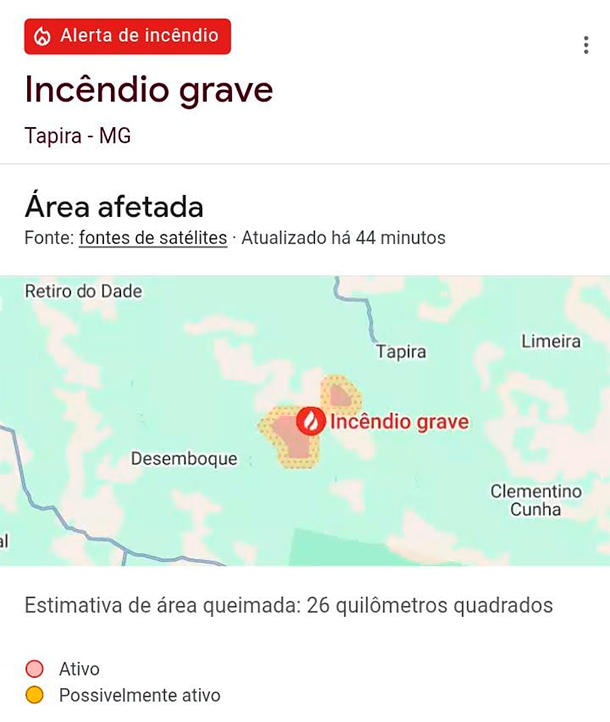 Durante a quinta-feira (11), sexta-feira (12) e sábado (13) boa parte das regiões do Tamboril e Nova Suécia ardeu em chamas. Na tarde de sábado ocorreram vários focos de incêndio espalhados por uma área de cerca de 26 km2, como mostra o alerta emitido pela Defesa Civil do Estado e Minas Gerais.