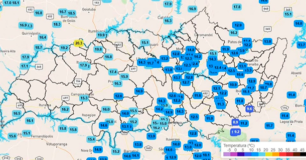Segundo o Boletim Meteorológico - Triângulo Mineiro e Alto Paranaíba de hoje (21), elaborado pelo Geógrafo William Borges, Tapira teve a menor temperatura de toda a mesorregião, com os termômetros aferindo 8,9° C no início dessa manhã.