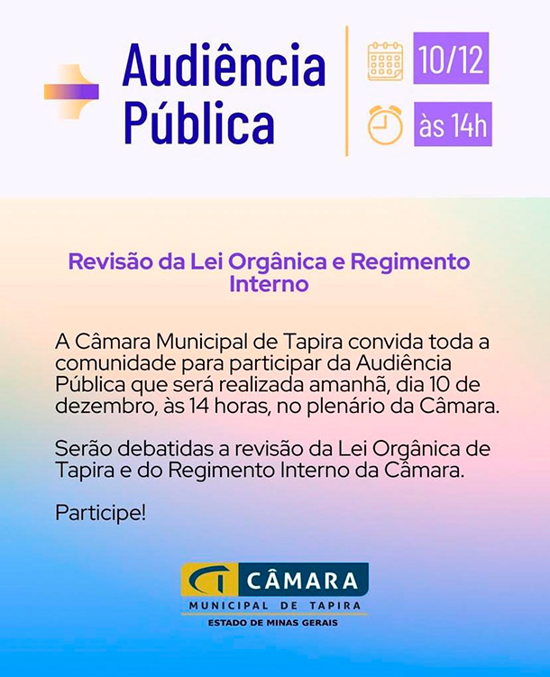 Na oportunidade serão debatidas a revisão da Lei Orgânica de Tapira e do Regimento Interno da Câmara.