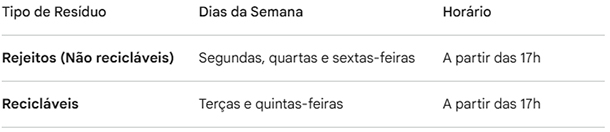 Para evitar o acúmulo de sacos de lixo nas calçadas em horários impróprios, o que pode causar sujeira e atrair animais, os cidadãos devem ficar atentos aos dias específicos para cada tipo de material: