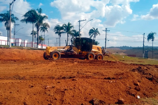 A nova quadra esportiva será gramada, cercada com alambrado metálico e iluminada e está sendo construída em frente ao Parque de Exposições, no Bairro Morada do Sol.