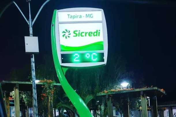 O totem do Sicredi Ibiraiaras RS/MG instalado na Praça Antônio Venâncio de Souza aferiu a temperatura de 2º C e dá um pouco da dimensão do frio no início do dia de hoje.