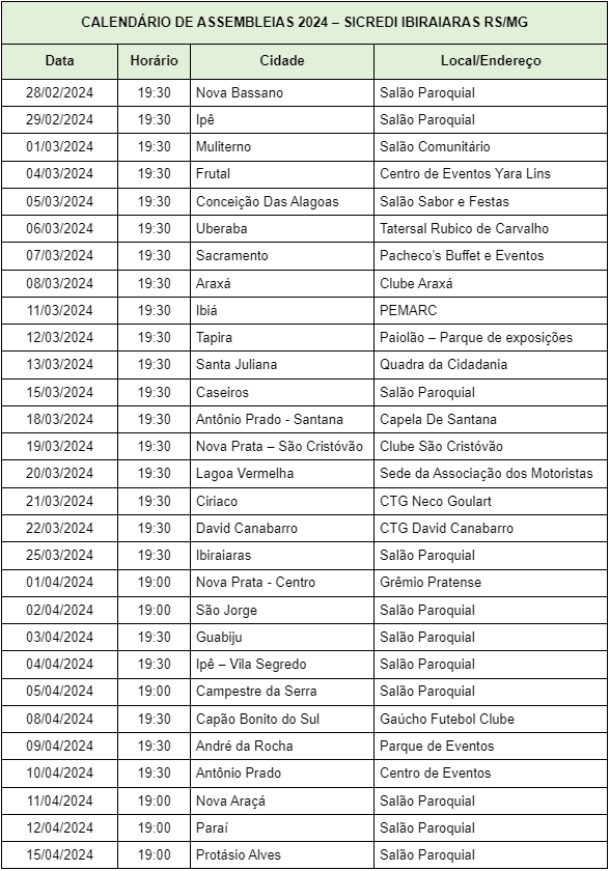 Com o objetivo de apresentar os resultados e decidir sobre as estratégias para 2024, as cooperativas do Sicredi darão início às assembleias anuais. Os encontros da Sicredi Ibiraiaras RS/MG com seus associados ocorrerão entre os dias 28 de fevereiro e 15 de abril no formato presencial na área de ação da Cooperativa no Rio Grande do Sul e em Minas Gerais (ver calendário abaixo). Já a Assembleia Geral Extraordinária e Ordinária (AGEO) para Delegados, ocorrerá no dia 26 de abril no Grêmio Pratense em Nova Prata.