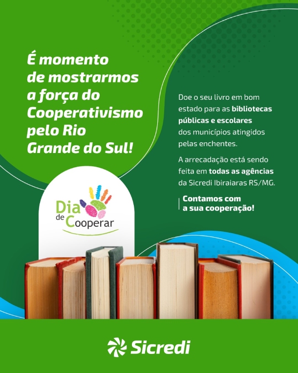 A Sicredi Ibiraiaras RS/MG lançou no dia 06 de julho uma campanha de arrecadação de livros literários novos e usados em bom estado de conservação, que serão destinados para as bibliotecas públicas e escolares dos municípios atingidos pelas enchentes no Rio Grande do Sul. A arrecadação está sendo feita em todas as agências da Cooperativa até o dia 26 de agosto.