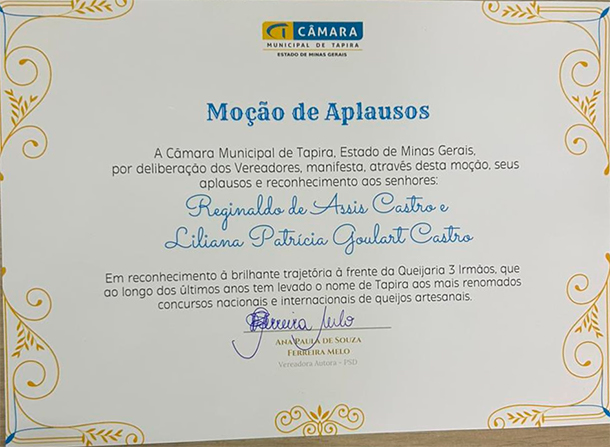 “É motivo de orgulho para todos nós ver um trabalho iniciado de forma simples alcançar o reconhecimento mundial. Essa Moção é um gesto de respeito e gratidão a um casal que tanto contribui para o desenvolvimento de Tapira e para a valorização da nossa tradição mineira na produção de queijos artesanais”, afirmou a vereadora.