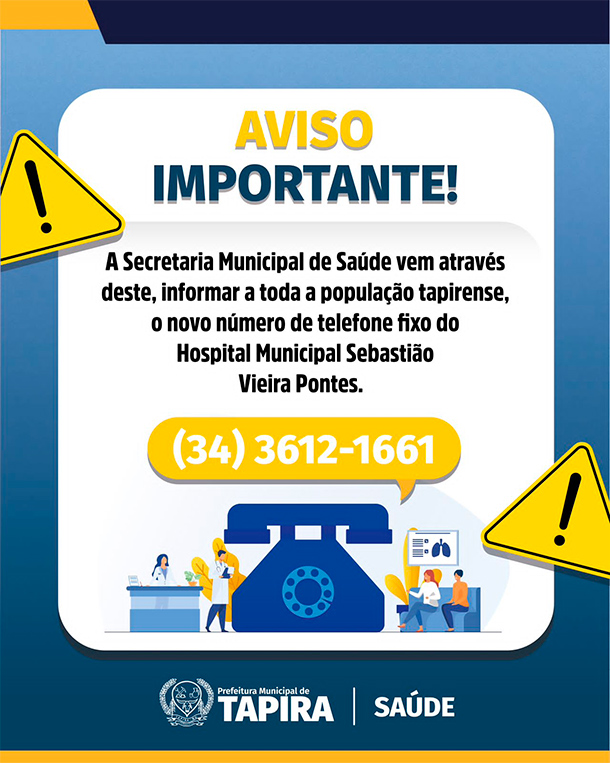 A Secretaria Municipal de Saúde de Tapira informou através das redes sociais o novo número de telefone fixo do Hospital Municipal.