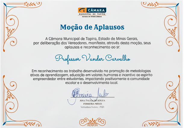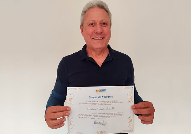O professor Vander Carvalho de Souza recebeu da Câmara Municipal de Tapira, por indicação da vereadora Ana Paula de Souza Ferreira Melo, uma Moção de Aplausos.