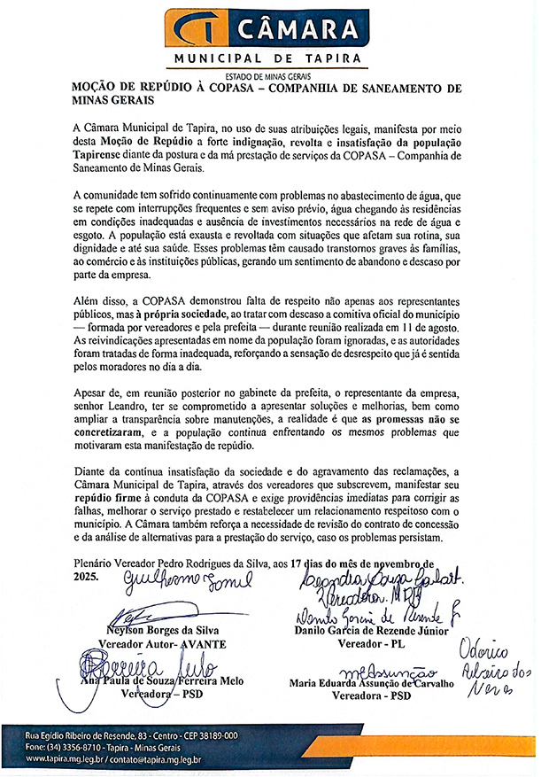 A Câmara Municipal de Tapira, aprovou por unanimidade, em sua reunião ordinária realizada na última segunda-feira (17) no Plenário Vereador Pedro Rodrigues da Silva, uma Moção de Repúdio para a COPASA - Companhia de Saneamento de Minas Gerais.