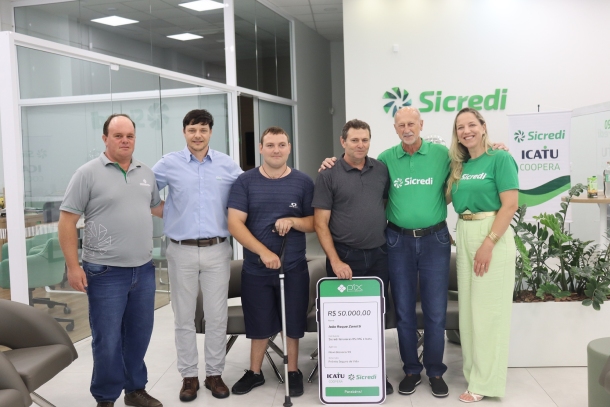 Além do ganhador, participaram do ato o presidente da Sicredi Ibiraiaras RS/MG, Sadi Bento Rigotti; a assessora de Segmentos de Associados, Julia Lima Reginato; a gerente da agência de Nova Bassano, Claudia Cestonaro Sasso; o coordenador de núcleo, Vanderlei Zanetti; e o representante comercial da Icatu, Vinicius Raguzoni Muller, além de colaboradores e associados da cooperativa.
