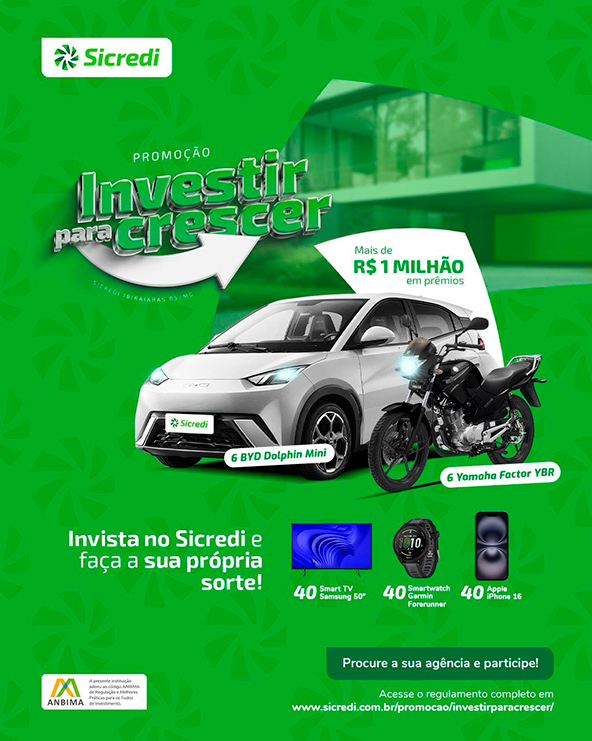 Nesta edição, os sorteios da promoção Investir para Crescer serão realizados com base nos resultados da Loteria Federal, contemplando associados por agência e por região, ao longo de cinco etapas. Entre os prêmios estão 40 relógios smartwatchs, 40 smartphones iPhone 16, 40 televisores Smart TV, seis motocicletas 0km e, no sorteio final, seis automóveis BYD Dolphin Mini 0km, avaliado em R$ 105 mil cada.