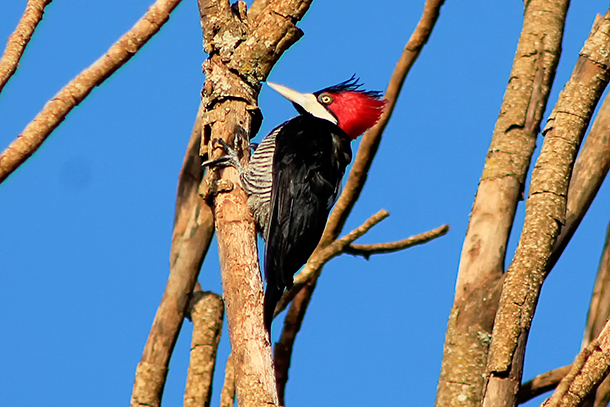 O pica-pau de topete vermelho (Campephilus melanoleucos) fazendo seu forte bico colidir contra a casca de uma árvore seca à procura de larvas de insetos.