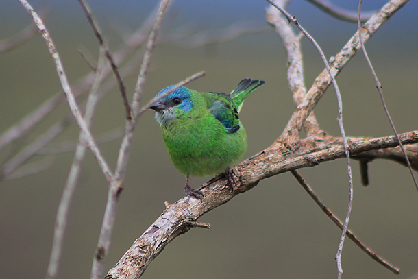 A fêmea de saí azul (Dacnis cayana), legítimo exemplar da fauna da Mata Atlântica, que vive em bordas de matas, capoeiras e jardins, alimentando-se de frutos, néctar e insetos.